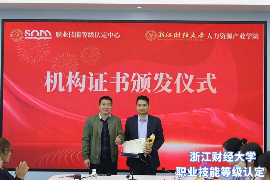 我校人力资源产业学院执行院长吴道友教授为杭州莘华教育科技有限公司徐源远校长颁发机构合格考生证书。