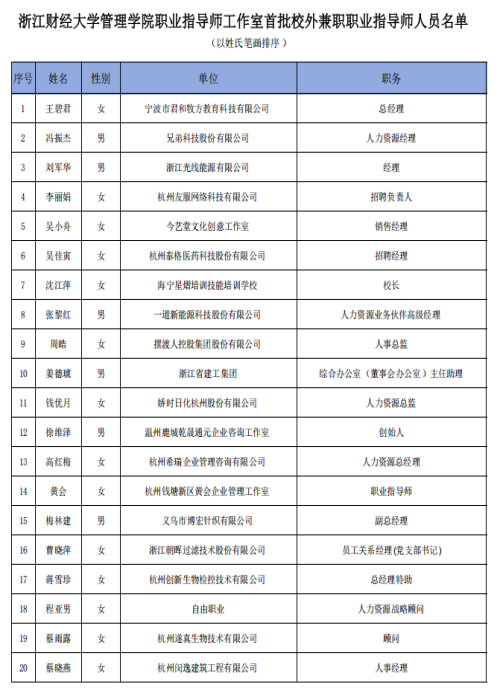 为深入贯彻立德树人根本任务,健全 “全程化、精准化、多元化” 就业指导服务体系,根据《浙江财经大学管理学院职业指导师工作室关于开展首批校外兼职职业指导师聘任的通知》相关规定,工作室严格遵循公开、公平、公正原则,现已确定首批校外兼职职业指导师人员名单。现将具体名单公布如下: