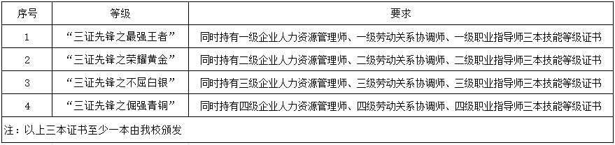 为构建人力资源从业者“铁三角”核心能力,我校鼓励人力资源从业者参加企业人力资源管理师、劳动关系协调师、职业指导师技能等级认定,对于同时取得上述三本技能等级证书考生,称为“三证先锋”考生(下简称“三证先锋”)。
