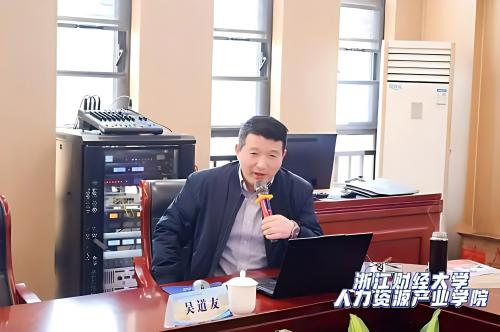 浙江财经大学人力资源产业学院执行院长吴道友教授,产业学院实务教师杨文超博士、黄会老师,围绕职业指导核心能力提升主题开展专题培训。培训内容系统全面,涵盖职业指导理论基础、职业咨询实务技巧、职业测评工具应用、高校毕业生就业创业形势分析、职业指导课程设计与呈现等核心模块,既深入解读了职业指导相关法律法规与政策导向,又结合高校职业指导一线真实案例,引导学员将理论知识转化为解决实际问题的能力,有效破解职业指导工作中的难点与痛点。