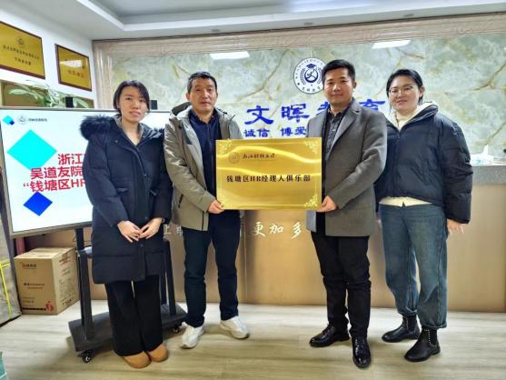 12月26日,浙江财经大学钱塘区HR经理人俱乐部授牌仪式在杭州市钱塘区文晖职业技能培训学校举行,浙江财经大学人力资源产业学院执行院长吴道友教授及杭州市钱塘区文晖职业技能培训学校邬晓东校长出席了此次授牌仪式。