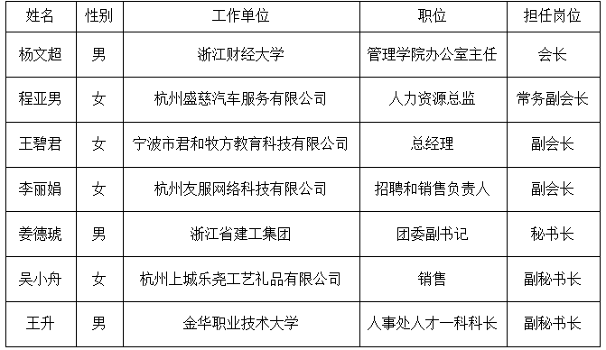 为健全协会组织机构,保障各项工作规范有序开展,根据《浙江财经大学(校友)职业指导师协会章程》及《浙江财经大学(校友)职业指导师协会组织架构及相关领导岗位选举办法》相关规定,协会严格遵循公开、公平、公正原则,经常务理事会提出领导班子人选建议、理事会投票表决,现已确定浙江财经大学(校友)职业指导师协会领导班子人员名单。现将具体名单公布如下: