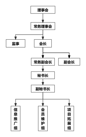 第二条 协会设立理事会、常务理事会、会长、监事、常务副会长、副会长、秘书长、副秘书长、常务理事、理事等机构和领导职位。协会组织架构如下图所示: