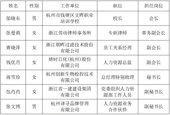 为健全协会组织机构,保障各项工作规范有序开展,根据《浙江财经大学(校友)劳动关系协调师协会协会章程》及《浙江财经大学(校友)劳动关系协调师协会组织架构及相关领导岗位选举办法》相关规定,协会严格遵循公开、公平、公正原则,经常务理事会提出领导班子人选建议、理事会投票表决,现已确定浙江财经大学(校友)劳动关系协调师协会领导班子人员名单。现将具体名单公布如下: